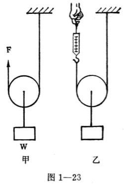 從圖1-22乙所示的實驗可以發現,彈簧秤的示數總跟祛碼的重量相等。這表明使用定滑輪不能省力,但可以改變力的方向。